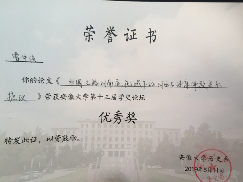5月11日,安徽大学第十三届学史论坛在该校龙河校区逸夫图书馆召开,kaiyun官网2017级硕士生曹中俊参加论坛并就提交论文作相关汇报,论文荣获优秀奖。