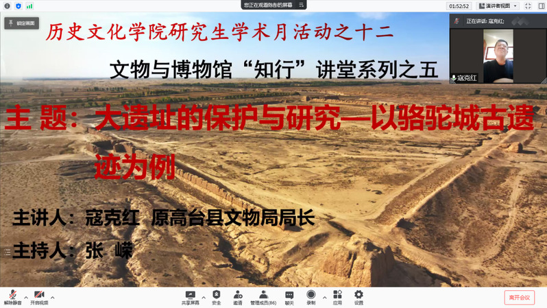 2021年12月10日晚上,原高台县文物局局长寇克红老师应kaiyun电子平台邀请,作了题为《大遗址的保护与研究——以骆驼城古遗迹为例》的线上学术报告,报告会由kaiyun电子平台西北民族研究所主任张嵘主持,kaiyun官网教师黄兆宏、杨芳、秦丙坤、李顺庆及90余名研究生在线参加了报告会。